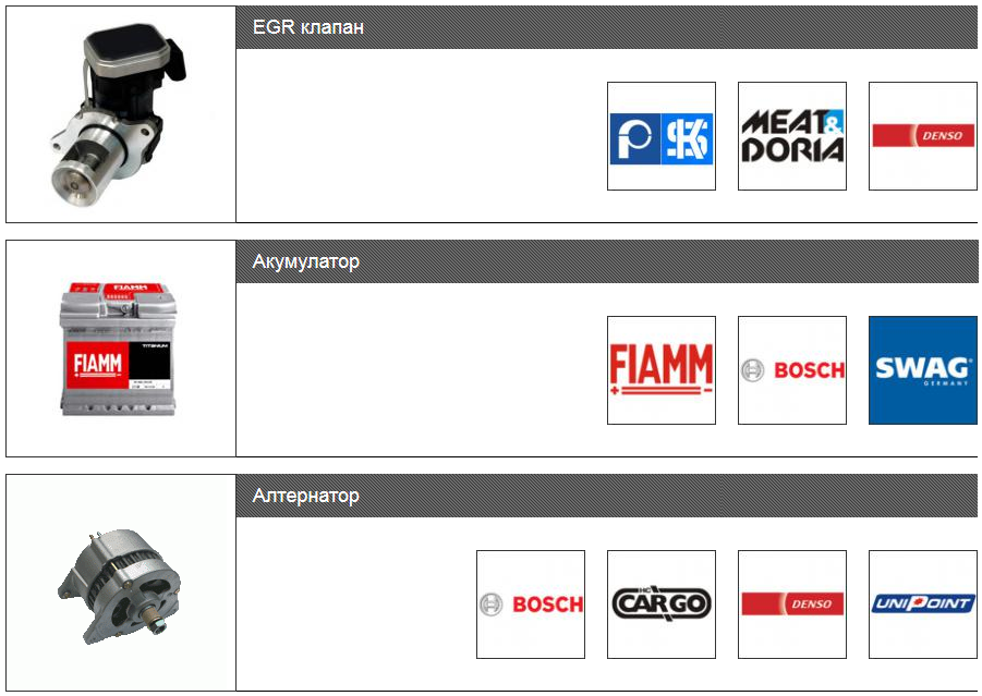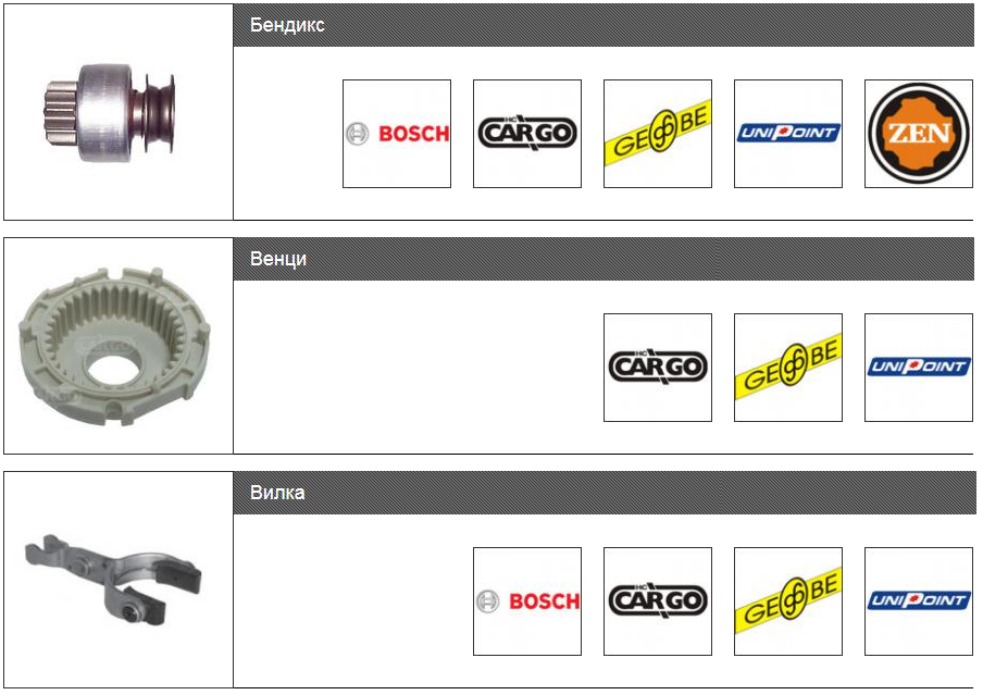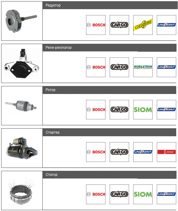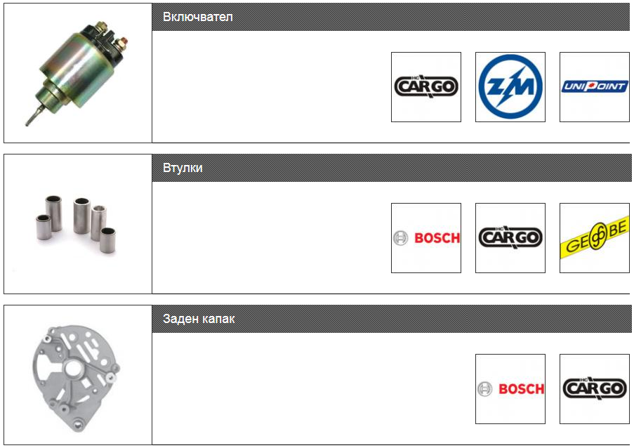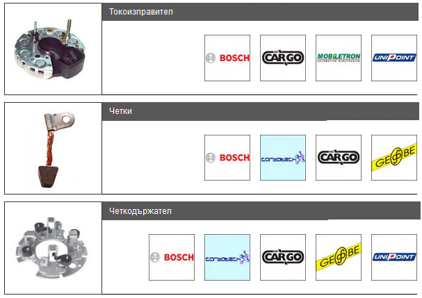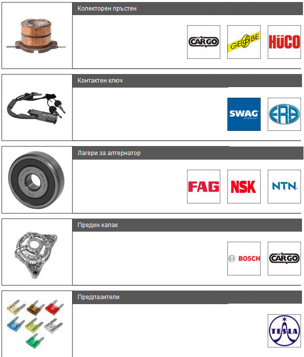 Акумулатори, Бендикс, Букси, Втулка за стартер, Диодна плочка генератор, Имобилайзер, Кабели за акумулатор, Клема за акумулатор, Контактни ключове и клеми, Легло за предпазител, Предпазители, Регулатор на напрежението, Редуктор за стартер, Релета, Ремонтен к-т за стартер, Скоба пластмасова, Табло ел.предпазители, Тампон алтернатор, Четки за стартер/генератор, Четкодържател, Шайба генератор, Шалтер за стартер